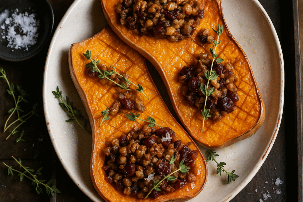 Baked Squash with Mushroom & Nut Roast Stuffing
