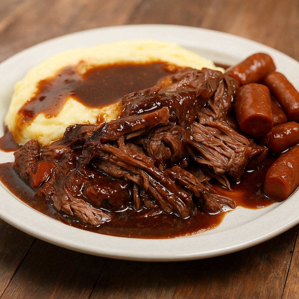 A comforting, tender pot roast slow-cooked in a flavorful broth with bacon, wine, and aromatic herbs. Perfect for a hearty family meal.