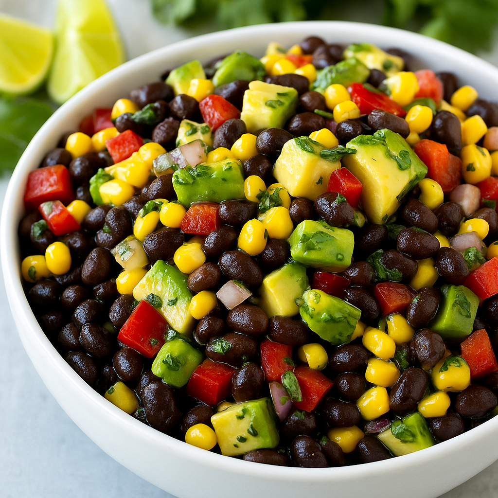 This vibrant, flavor-packed salad is loaded with black beans, corn, avocado, and colorful veggies—all tossed in a zesty lime-garlic dressing. Perfect as a side dish, light lunch, or dip with chips!