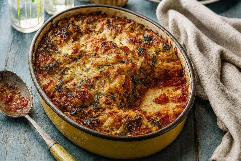 This fresh and cheesy lasagne swaps out the traditional meat for grated courgettes, creamy ricotta, and a rich tomato sauce. It’s simple, satisfying, and perfect for a weeknight vegetarian dinner.