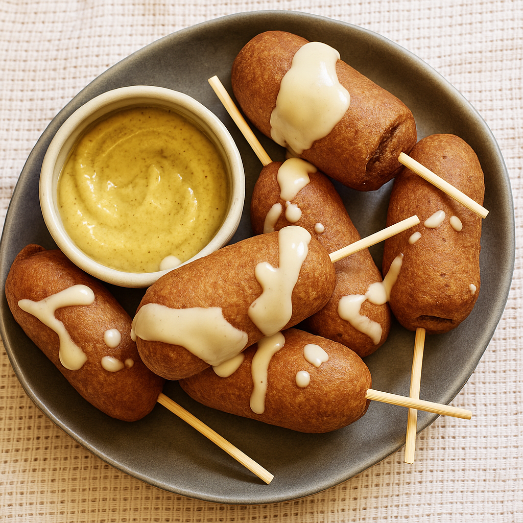 Dip each hot dog into the batter, ensuring it’s evenly coated. Carefully lower it into the hot oil, holding for 10–15 seconds to help it set. Once it floats, release and let fry until golden brown, about 5–8 minutes.Drain and garnish: