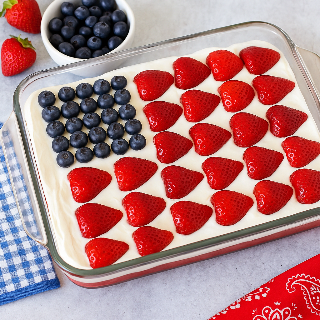 Celebrate the 4th of July or any patriotic occasion with this light, creamy, and visually stunning dessert—no oven required! The fresh strawberries and blueberries create a beautiful stars-and-stripes design that’s sure to impress your guests.