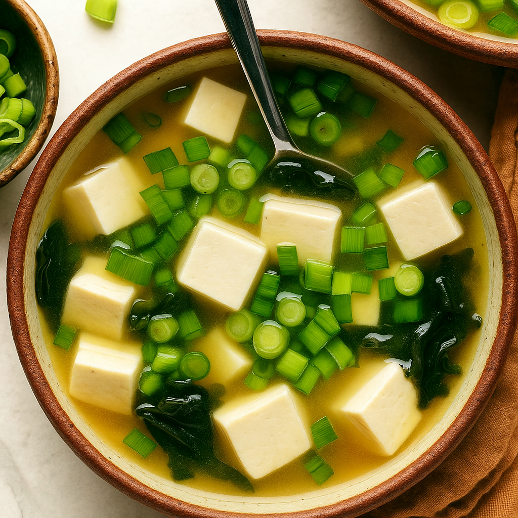 A warm, comforting bowl of miso soup filled with savory, umami-rich flavors. Customize it to your taste with different types of miso paste, yellow for sweetness, red for a stronger, saltier kick. Adjust the dashi for a richer stock.