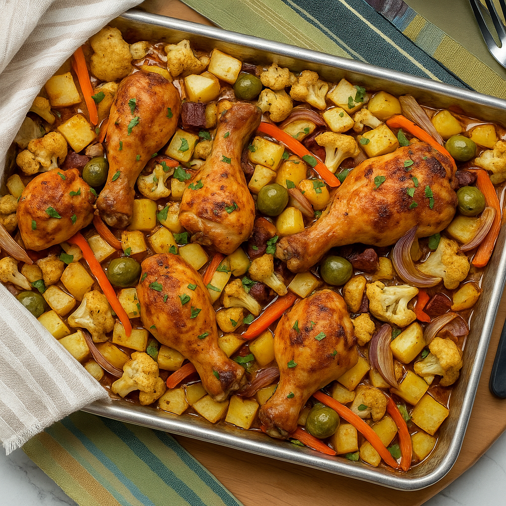 This all-in-one tray-bake features juicy, herb-marinated chicken thighs roasted to perfection alongside buttery roasted cauliflower “steaks” topped with melted cheddar, crispy bacon, sour cream, and chives. It’s a low-carb, flavor-packed meal that’s both comforting and easy to prepare.